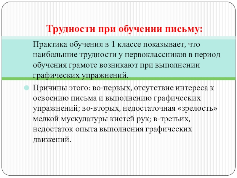 Причины этого: во-первых, отсутствие интереса к освоению письма и выполнению графических упражнений; во-вторых, недостаточная «зрелость» мелкой мускулатуры кистей рук; в-третьих, недостаток опыта выполнения графических движений.