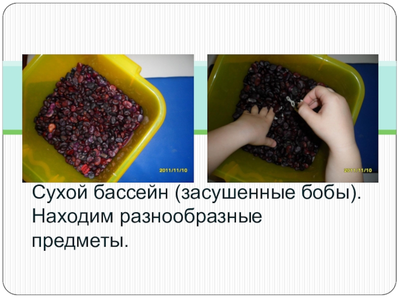 Слайд 24Сухой бассейн (засушенные бобы). Находим разнообразные предметы.