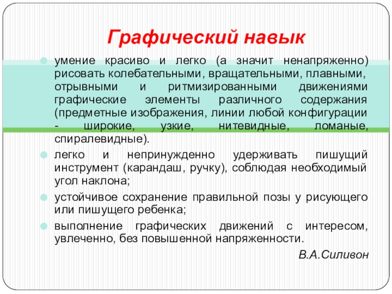выполнение графических движений с интересом, увлеченно, без повышенной напряженности.