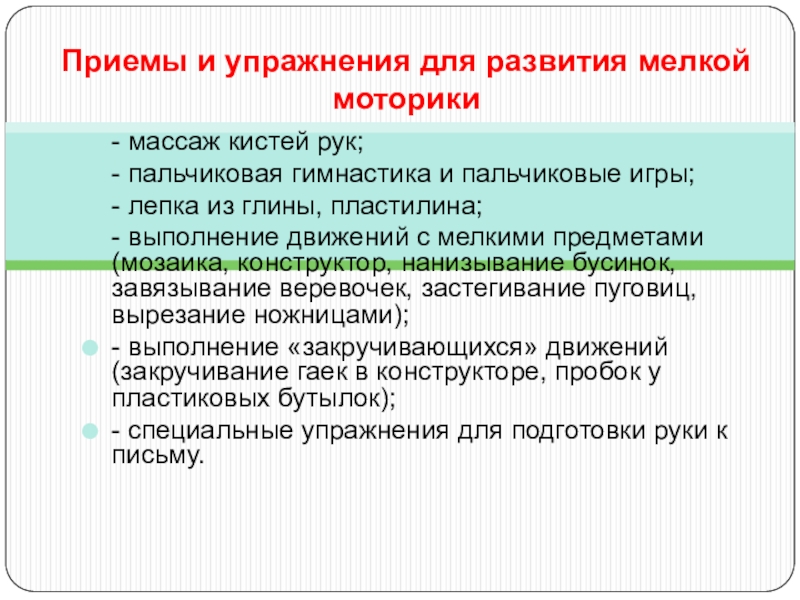 Слайд 12Приемы и упражнения для развития мелкой моторики