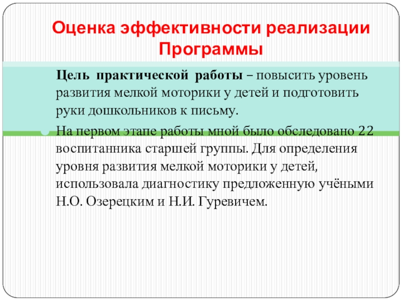 На первом этапе работы мной было обследовано 22 воспитанника старшей группы. Для определения уровня развития мелкой моторики у детей, использовала диагностику предложенную учёными Н.О. Озерецким и Н.И. Гуревичем.