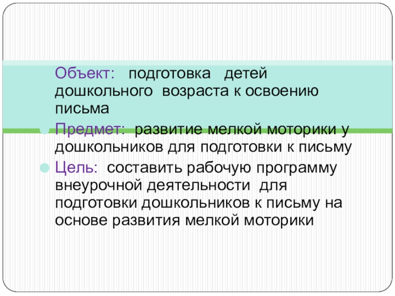 Слайд 4Объект: подготовка детей дошкольного возраста к освоению письма