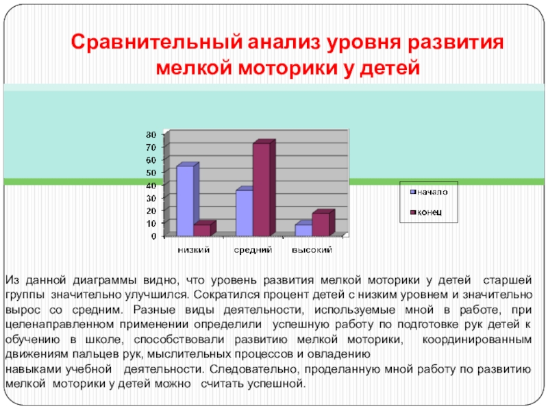 видно, что уровень развития мелкой моторики у детей старшей группы значительно улучшился. Сократился процент детей с низким уровнем и значительно вырос со средним. Разные виды деятельности, используемые мной в работе, при целенаправленном применении определили успешную работу по подготовке рук детей к обучению в школе, способствовали развитию мелкой моторики, координированным движениям пальцев рук, мыслительных процессов и овладению