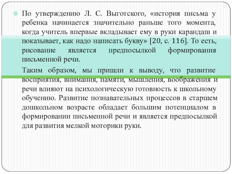 Слайд 7По утверждению Л. С. Выготского, «история письма у ребенка начинается значительно