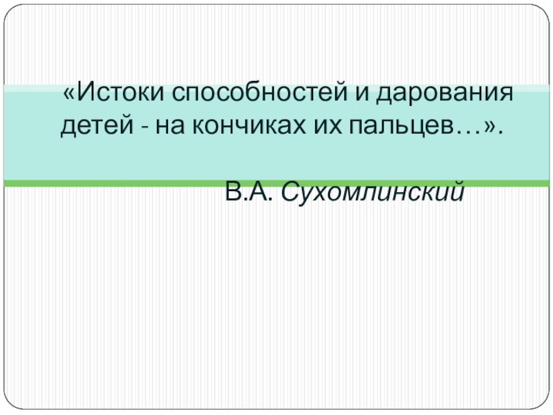 Слайд 2 «Истоки способностей и дарования детей - на кончиках их пальцев…».