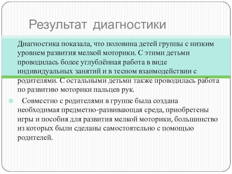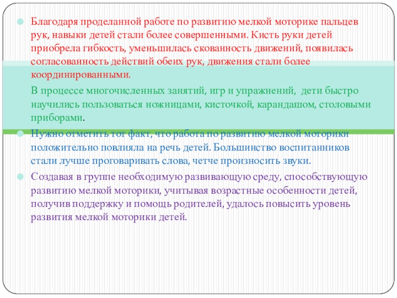 Слайд 35Благодаря проделанной работе по развитию мелкой моторике пальцев рук, навыки детей