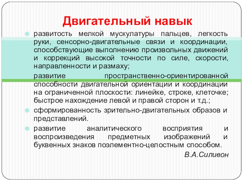 развитость мелкой мускулатуры пальцев, легкость руки, сенсорно-двигательные связи и координации,