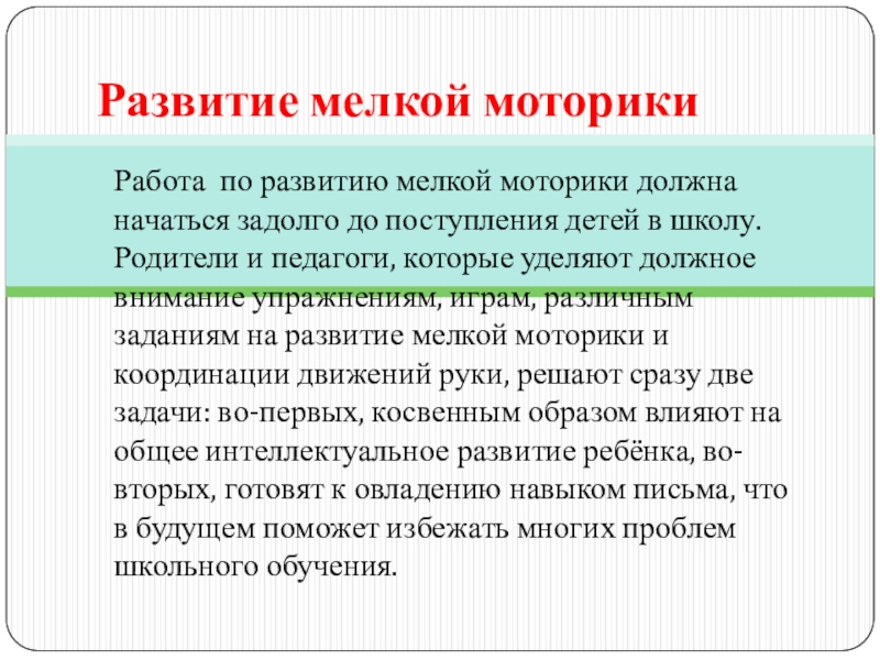 до поступления детей в школу. Родители и педагоги, которые уделяют должное внимание упражнениям, играм, различным заданиям на развитие мелкой моторики и координации движений руки, решают сразу две задачи: во-первых, косвенным образом влияют на общее интеллектуальное развитие ребёнка, во-вторых, готовят к овладению навыком письма, что в будущем поможет избежать многих проблем школьного обучения.