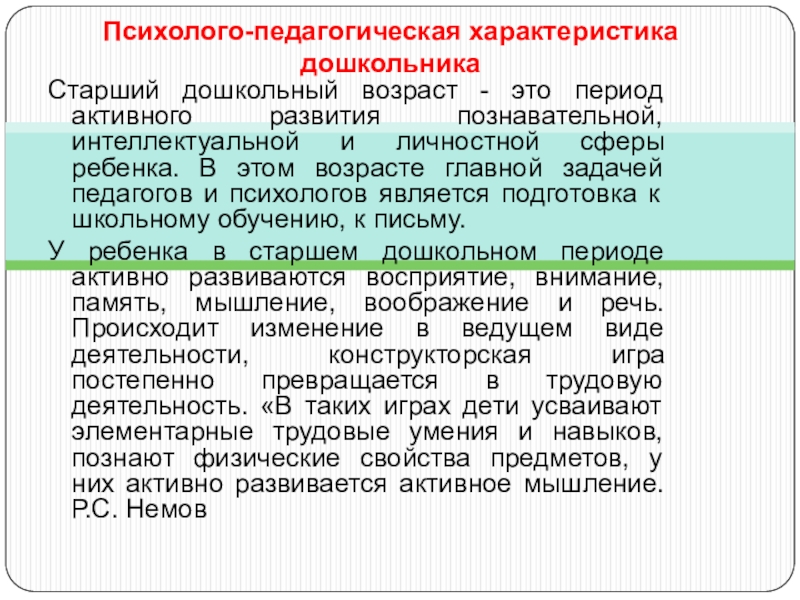 У ребенка в старшем дошкольном периоде активно развиваются восприятие, внимание, память, мышление, воображение и речь. Происходит изменение в ведущем виде деятельности, конструкторская игра постепенно превращается в трудовую деятельность. «В таких играх дети усваивают элементарные трудовые умения и навыков, познают физические свойства предметов, у них активно развивается активное мышление. Р.С. Немов