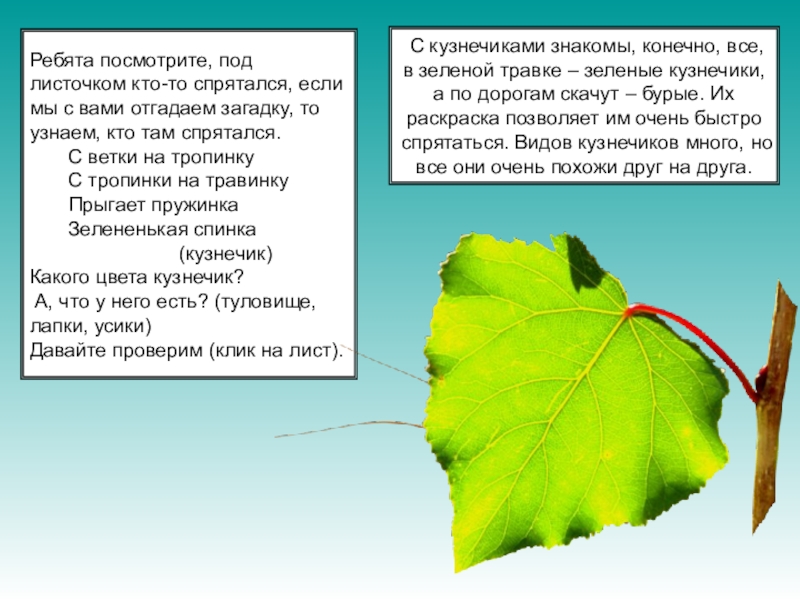 С кузнечиками знакомы, конечно, все, в зеленой травке – зеленые кузнечики, а по дорогам скачут – бурые. Их раскраска позволяет им очень быстро спрятаться. Видов кузнечиков много, но все они очень похожи друг на друга.