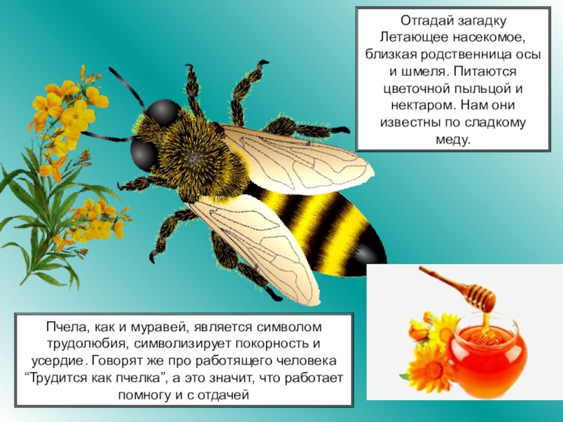 Летающее насекомое, близкая родственница осы и шмеля. Питаются цветочной пыльцой и нектаром. Нам они известны по сладкому меду.
