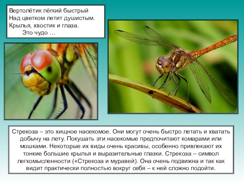 Стрекоза – это хищное насекомое. Они могут очень быстро летать и хватать добычу на лету. Покушать эти насекомые предпочитают комарами или мошками. Некоторые их виды очень красивы, особенно привлекают их тонкие большие крылья и выразительные глазки. Стрекоза – символ легкомысленности («Стрекоза и муравей). Она очень подвижна и так как видит практически полностью вокруг себя – к ней сложно подойти.