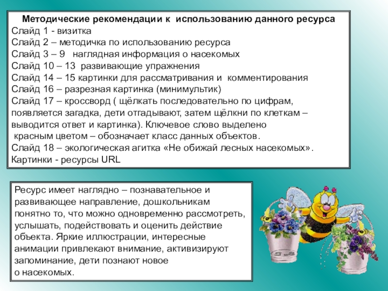 Ресурс имеет наглядно – познавательное и развивающее направление, дошкольникам понятно то, что можно одновременно рассмотреть, услышать, подействовать и оценить действие объекта. Яркие иллюстрации, интересные анимации привлекают внимание, активизируют запоминание, дети познают новое