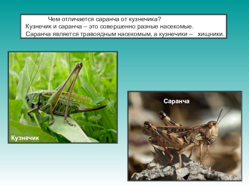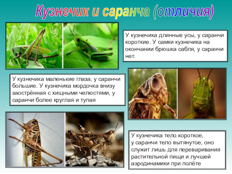 У кузнечика маленькие глаза, у саранчи большие. У кузнечика мордочка внизу заострённая с хищными челюстями, у саранчи более круглая и тупая