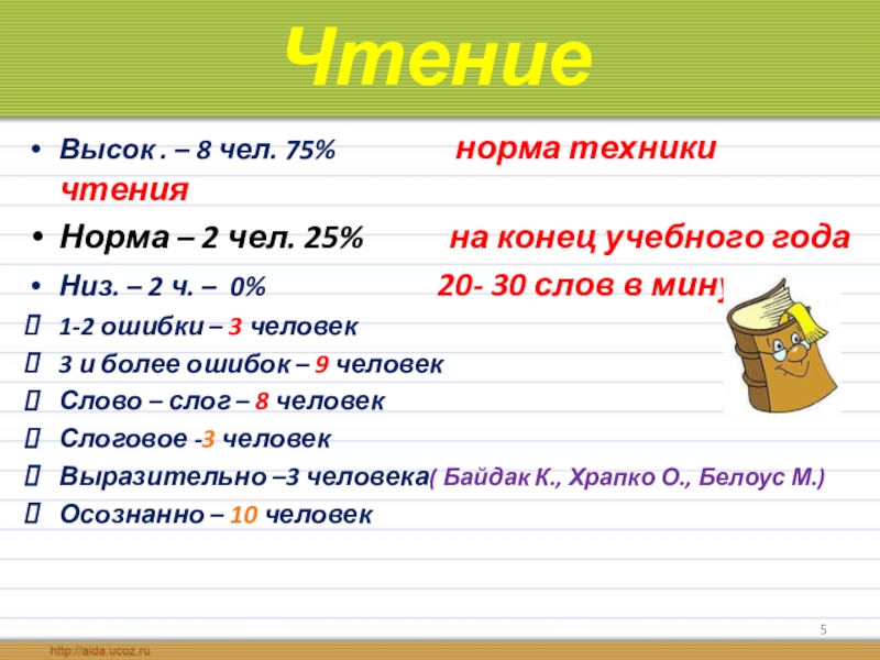 ЧтениеВысок . – 8 чел. 75%         норма техники чтенияНорма