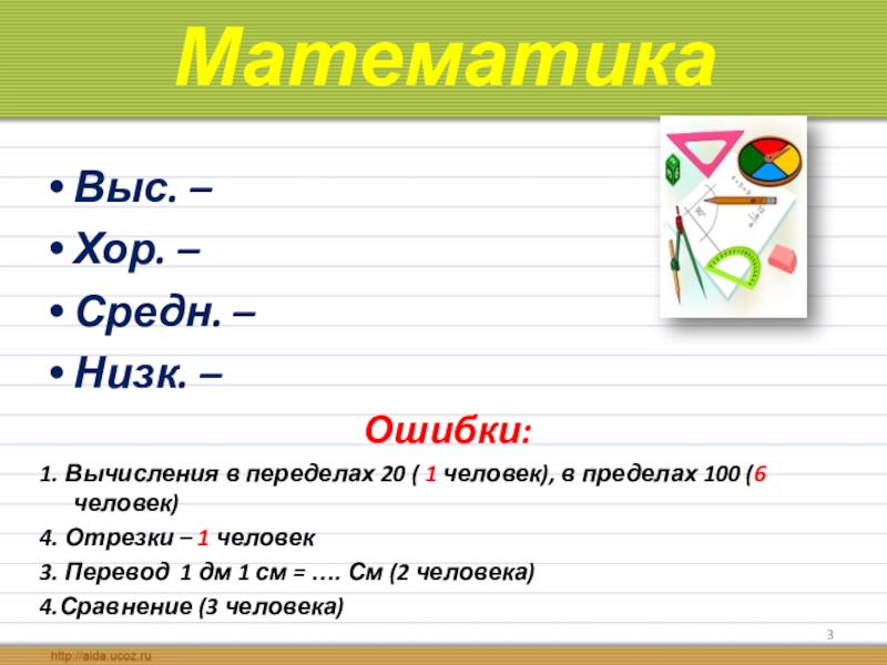 МатематикаВыс. – Хор. – Средн. – Низк. – Ошибки:1. Вычисления в переделах 20 ( 1 человек), в