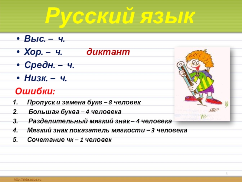 Русский языкВыс. – ч. Хор. – ч.      диктантСредн. – ч. Низк. –
