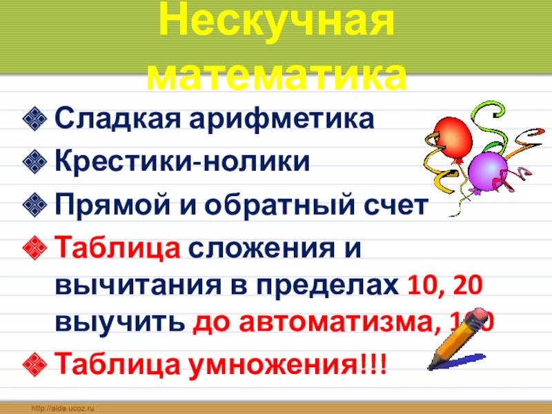 Нескучная математикаСладкая арифметикаКрестики-ноликиПрямой и обратный счетТаблица сложения и вычитания в пределах 10, 20 выучить до автоматизма, 100Таблица