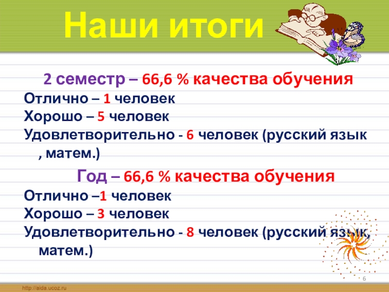 Наши итоги2 семестр – 66,6 % качества обученияОтлично – 1 человекХорошо – 5 человекУдовлетворительно - 6 человек