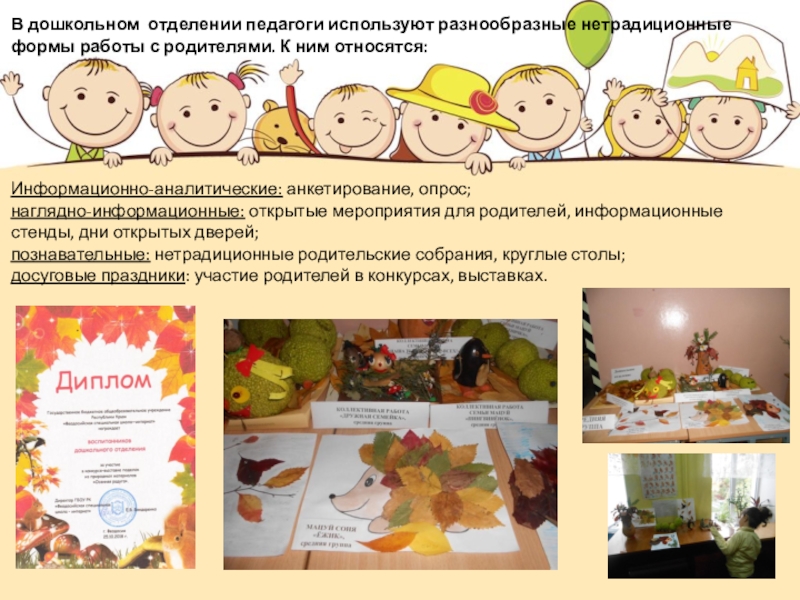 Семья и дошкольное учреждение – два важных социальных института социализации ребенка. Положительные результаты достигаются только при умелом сочетании разных форм сотрудничества, при активном включении в эту работу всех членов коллектива дошкольного учреждения и членов семей воспитанников.
