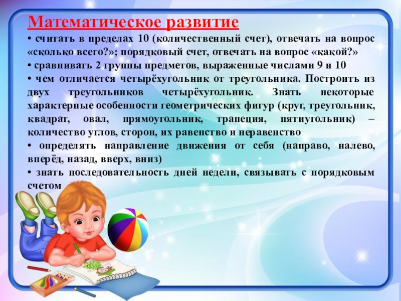 • считать в пределах 10 (количественный счет), отвечать на вопрос
