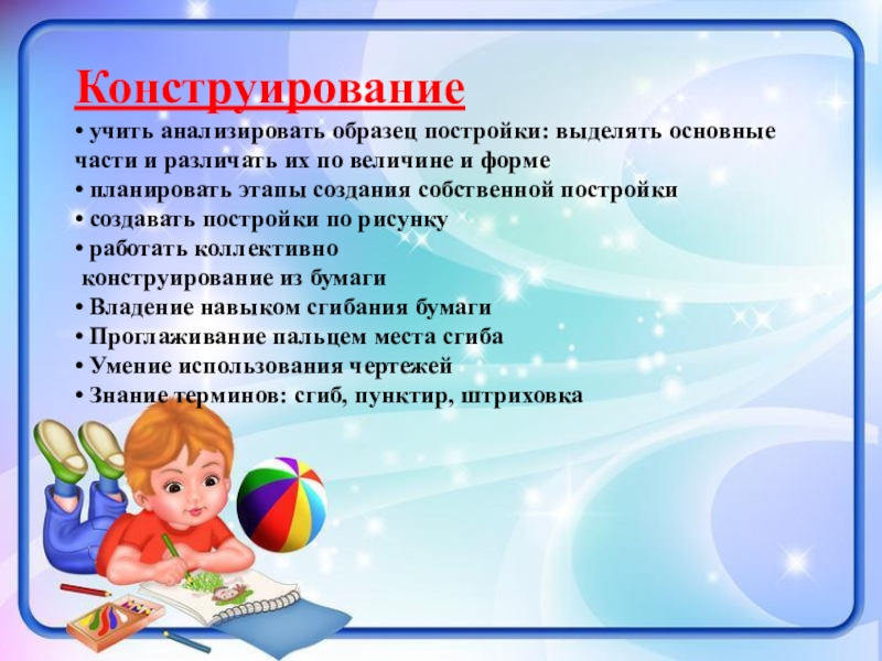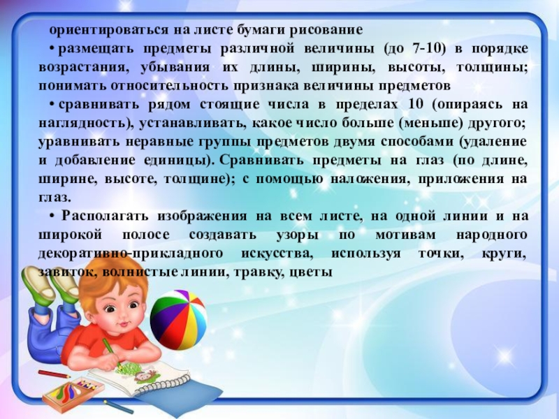 • Располагать изображения на всем листе, на одной линии и на широкой полосе создавать узоры по мотивам народного декоративно-прикладного искусства, используя точки, круги, завиток, волнистые линии, травку, цветы
