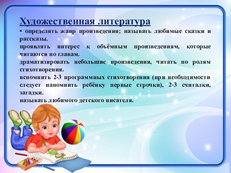 • определять жанр произведения; называть любимые сказки и рассказы.