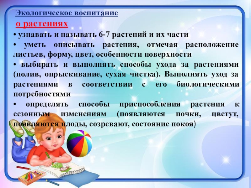 • выбирать и выполнять способы ухода за растениями (полив, опрыскивание, сухая чистка). Выполнять уход за растениями в соответствии с его биологическими потребностями