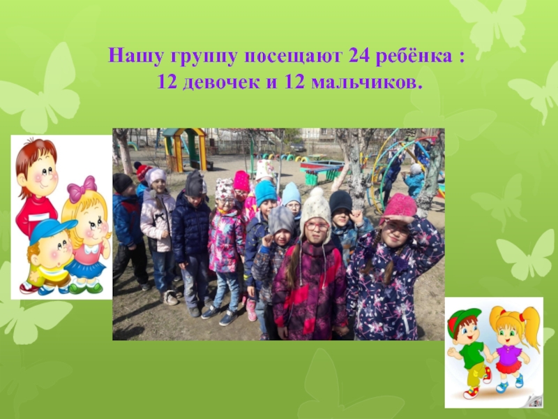 Слайд 2Нашу группу посещают 24 ребёнка : 12 девочек и 12 мальчиков.
