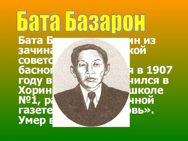 Слайд 6 Бата Базарович - один из зачинателей бурятской советской поэзии,