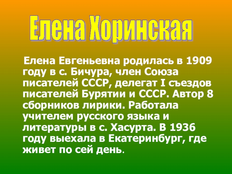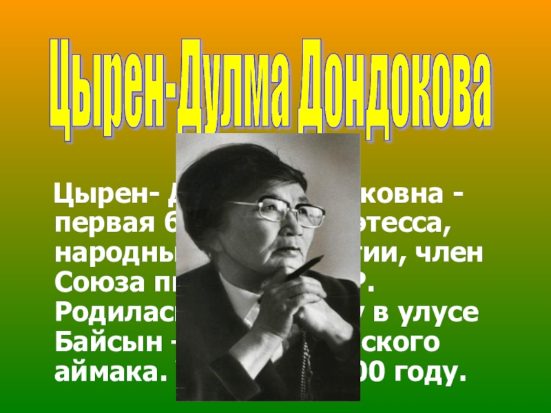 бурятская поэтесса, народный поэт Бурятии, член Союза писателей ССР. Родилась в 1911 году в улусе Байсын – Эбэр Хоринского аймака. Умерла в 2000 году.