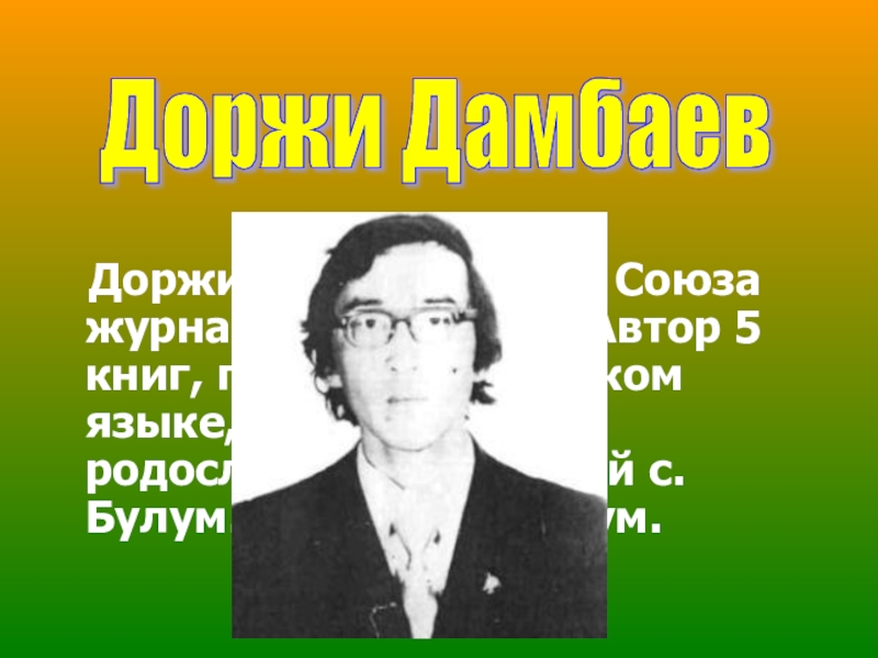 Слайд 28 Доржи Дабаевич член Союза журналистов России. Автор 5 книг,
