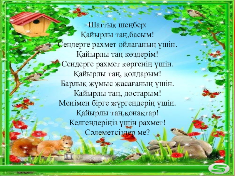 Шаттық шеңбер: Қайырлы таң,басым! Сендерге рахмет ойлағаның үшін. Қайырлы таң көздерім! Сендерге рахмет көргенің үшін. Қайырлы