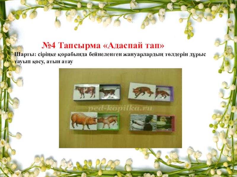 №4 Тапсырма «Адаспай тап» Шарты: сіріңке қорабында бейнеленген жануарлардың төлдерін дұрыс