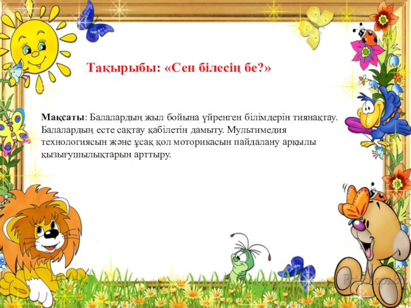Тақырыбы: «Сен білесің бе?»Мақсаты: Балалардың жыл бойына үйренген білімдерін тиянақтау.Балалардың есте сақтау қабілетін дамыту. Мультимедия технологиясын және