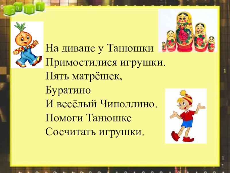 На диване у ТанюшкиПримостилися игрушки.Пять матрёшек,БуратиноИ весёлый Чиполлино.Помоги Танюшке Сосчитать игрушки.