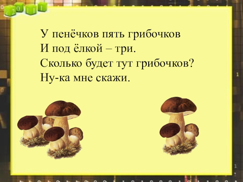 У пенёчков пять грибочковИ под ёлкой – три.Сколько будет тут грибочков?Ну-ка мне скажи.
