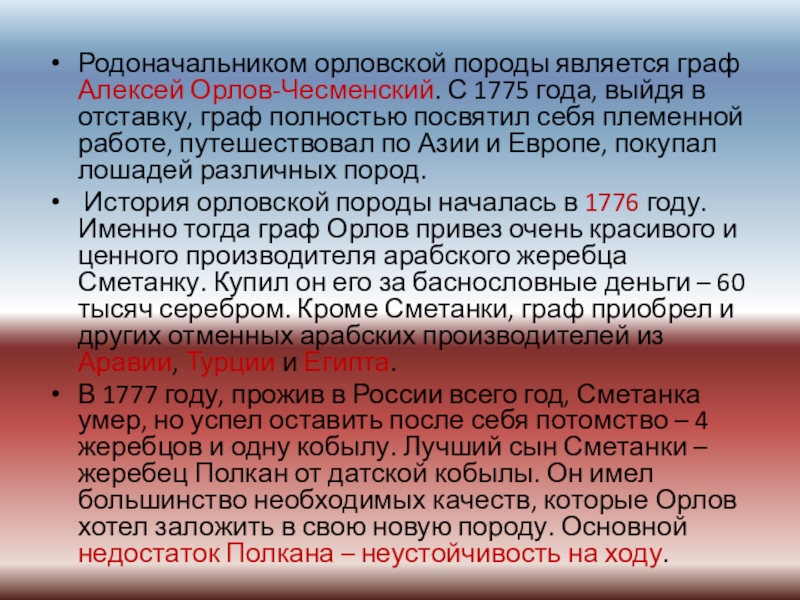 Слайд 4Родоначальником орловской породы является граф Алексей Орлов-Чесменский. С 1775 года, выйдя