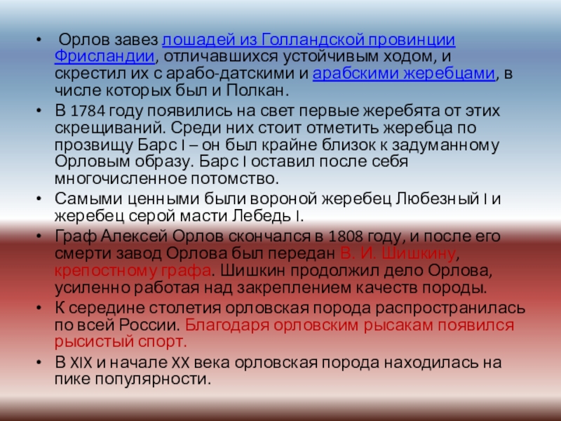Слайд 6 Орлов завез лошадей из Голландской провинции Фрисландии, отличавшихся устойчивым ходом, и