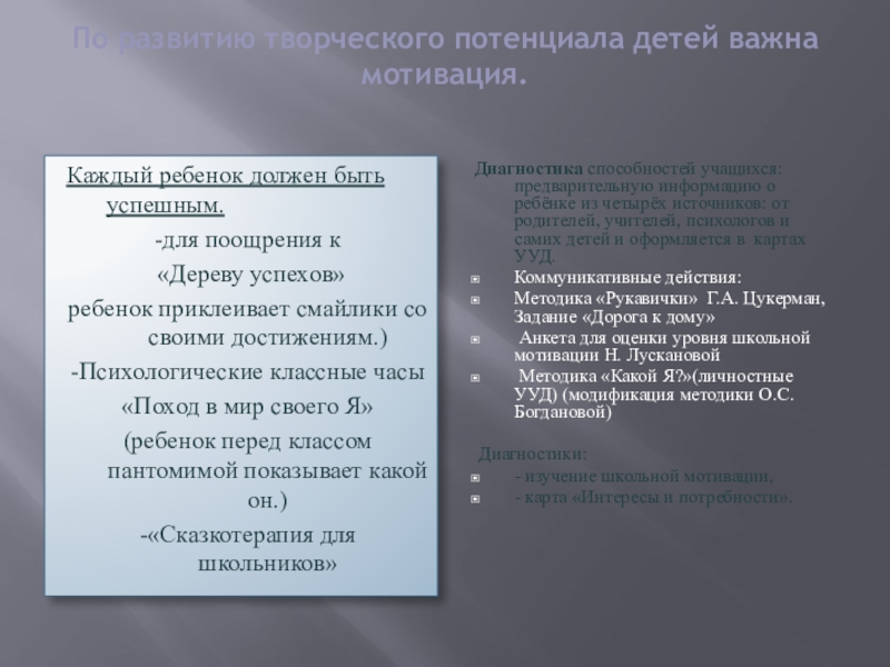 Диагностика способностей учащихся: предварительную информацию о ребёнке из четырёх источников: от родителей, учителей, психологов и самих детей и оформляется в картах УУД.