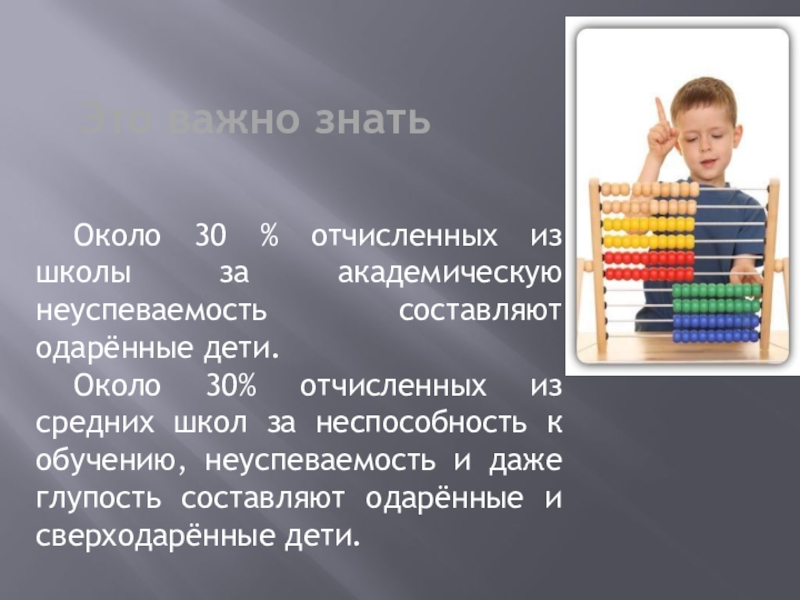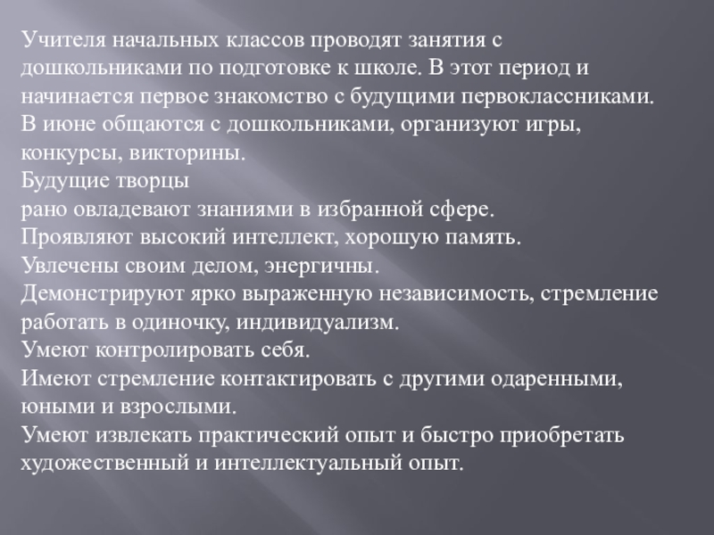 Одарённый ребёнок приходит в школу, как и любой другой школьник, чтобы учиться. И результат зависит от учителя, который хочется верить, разглядит в каждом его высшие потенциальные возможности.