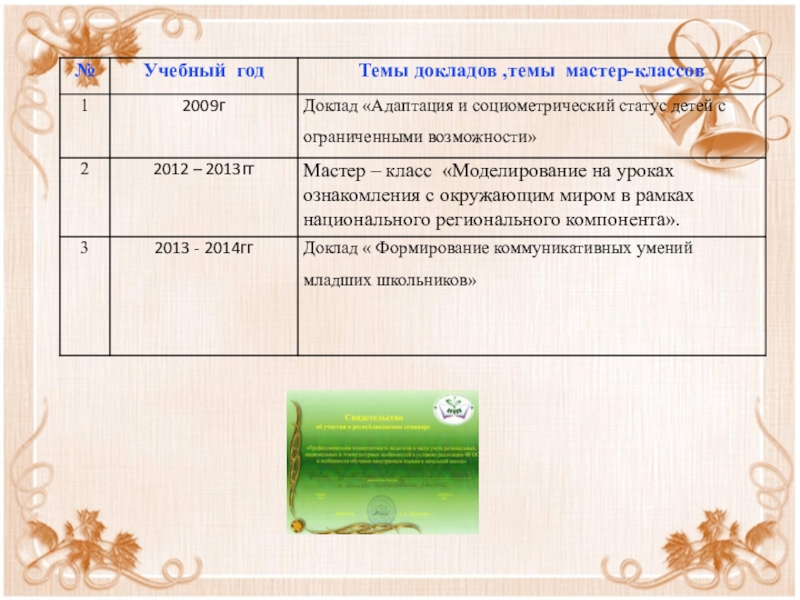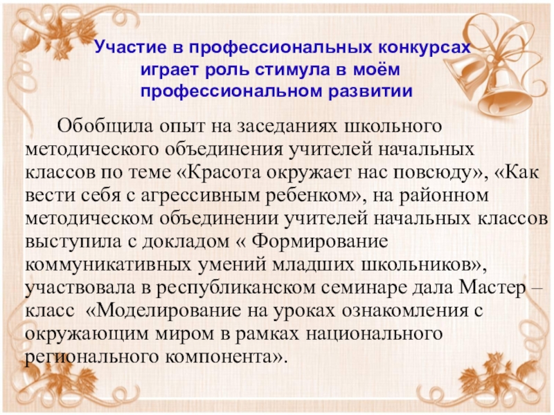 Обобщила опыт на заседаниях школьного методического объединения учителей начальных классов по теме «Красота окружает нас повсюду», «Как вести себя с агрессивным ребенком», на районном методическом объединении учителей начальных классов выступила с докладом « Формирование коммуникативных умений младших школьников», участвовала в республиканском семинаре дала Мастер – класс «Моделирование на уроках ознакомления с окружающим миром в рамках национального регионального компонента».