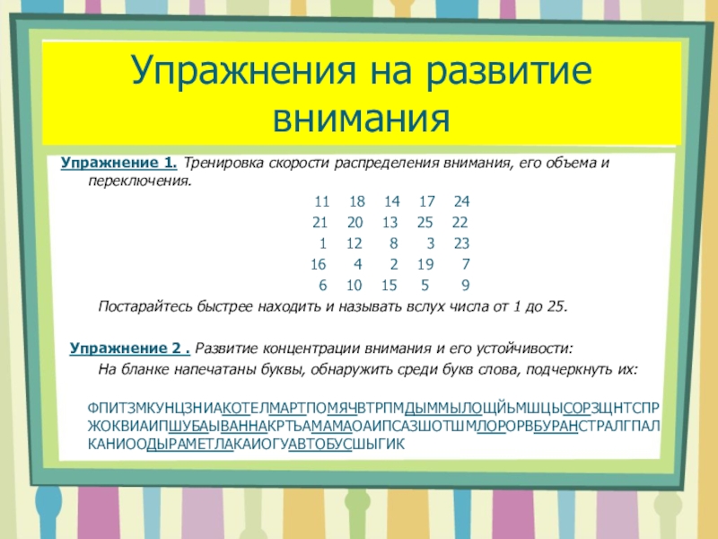 Упражнение 2 . Развитие концентрации внимания и его устойчивости: