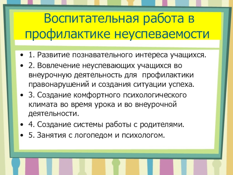 Слайд 9 Воспитательная работа в профилактике неуспеваемости