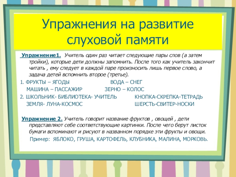 пары слов (а затем тройки), которые дети должны запомнить. После того как учитель закончит читать , ему следует в каждой паре произносить лишь первое слово, а задача детей вспомнить второе (третье).