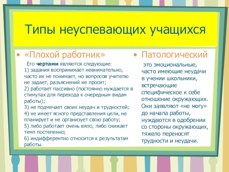 это эмоциональные, часто имеющие неудачи в учении школьники, встречающие специфическое к себе отношение окружающих. Они заявляют «не могу» до начала работы, нуждаются в одобрении со стороны окружающих, тяжело переносят трудности и неудачи.