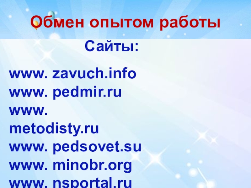 Это сайт презентаций, где можно хранить и обмениваться своими презентациями, докладами, проектами, шаблонами в формате PowerPoint с другими пользователями. Мы помогаем школьникам, студентам, учителям, преподавателям хранить и обмениваться учебными материалами.