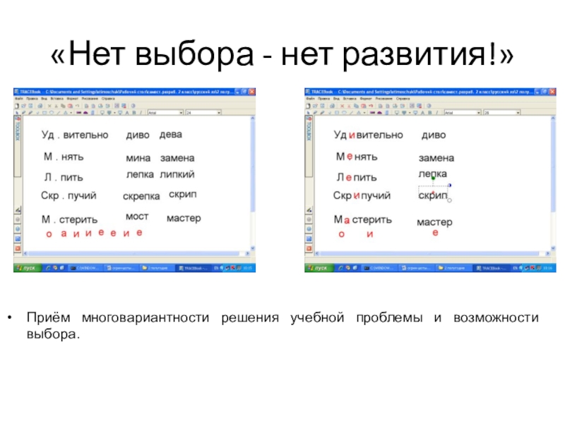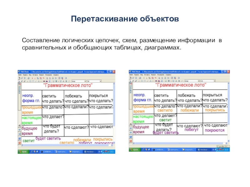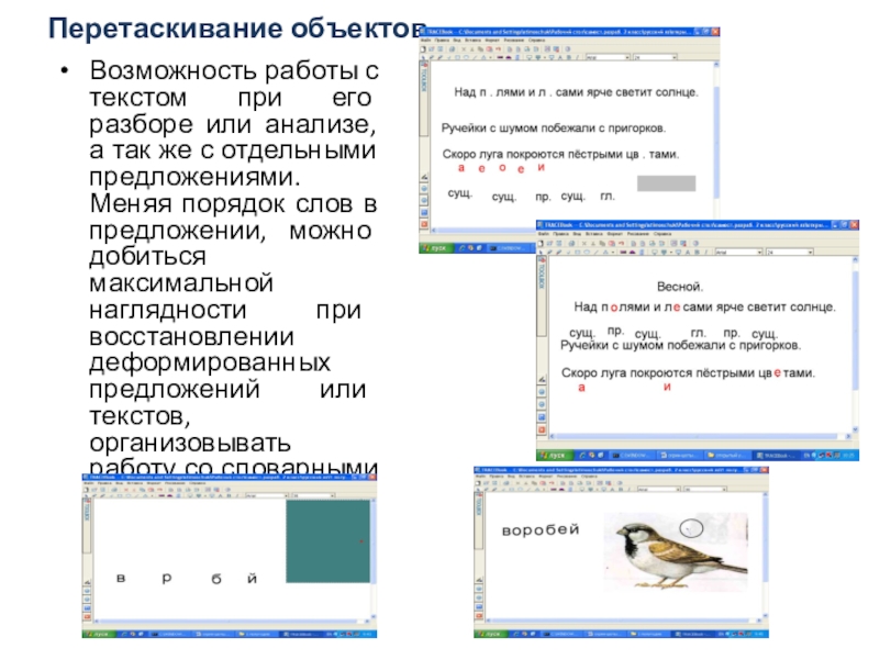 так же с отдельными предложениями. Меняя порядок слов в предложении, можно добиться максимальной наглядности при восстановлении деформированных предложений или текстов, организовывать работу со словарными словами.