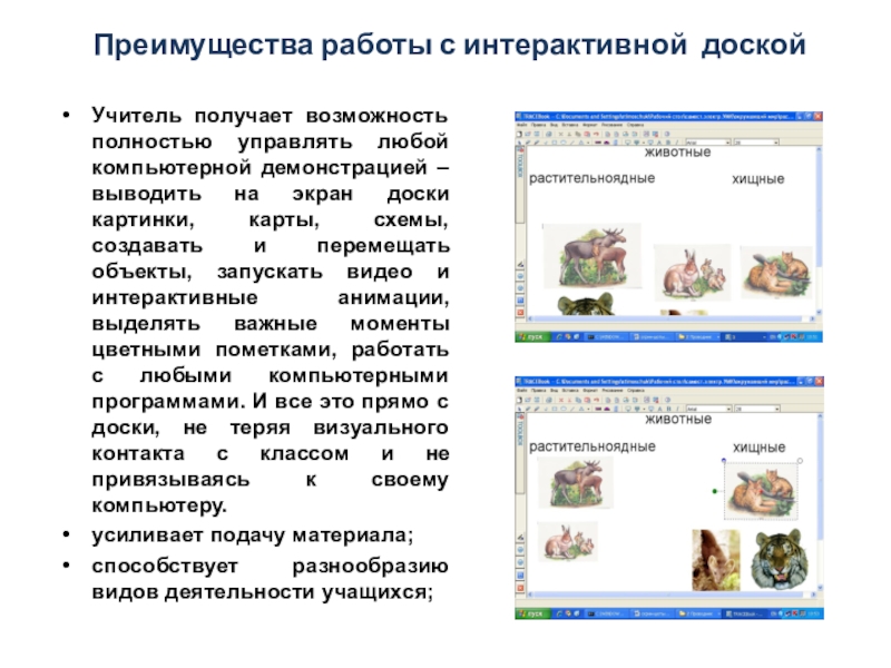 демонстрацией – выводить на экран доски картинки, карты, схемы, создавать и перемещать объекты, запускать видео и интерактивные анимации, выделять важные моменты цветными пометками, работать с любыми компьютерными программами. И все это прямо с доски, не теряя визуального контакта с классом и не привязываясь к своему компьютеру.