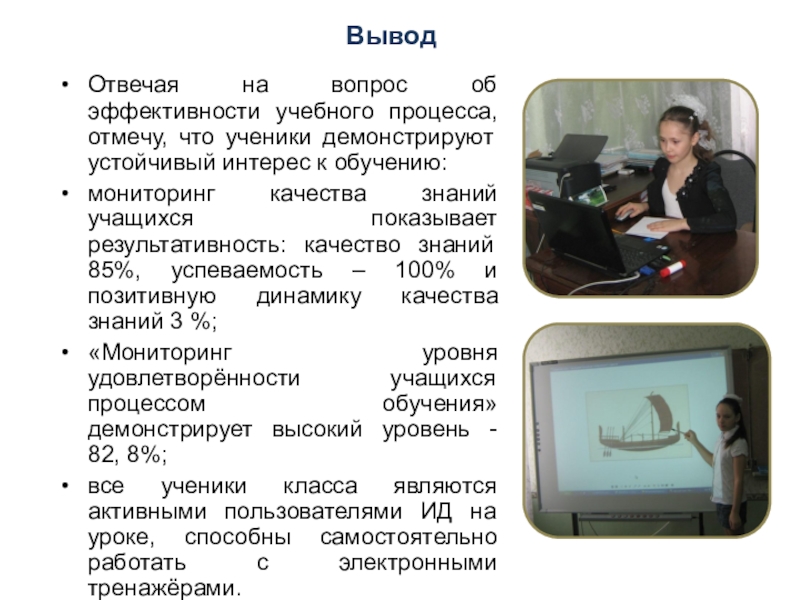 все ученики класса являются активными пользователями ИД на уроке, способны самостоятельно работать с электронными тренажёрами.